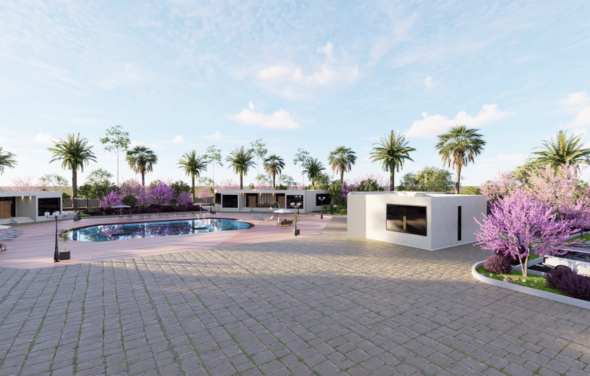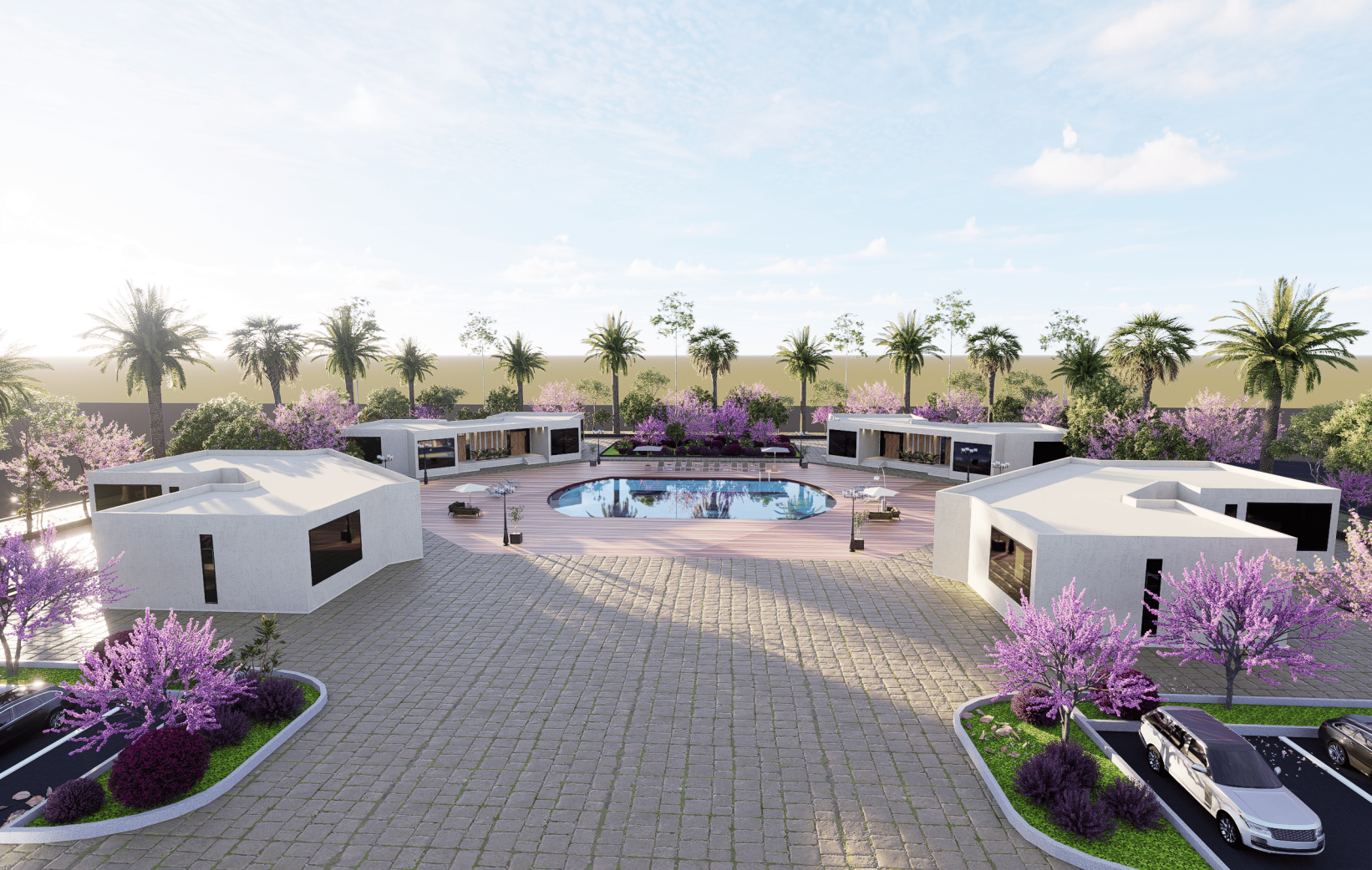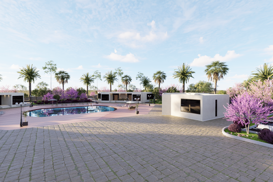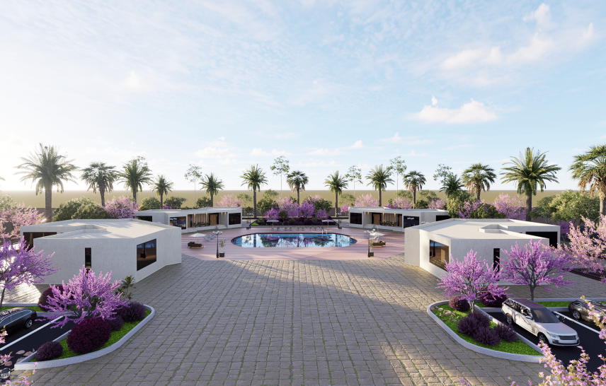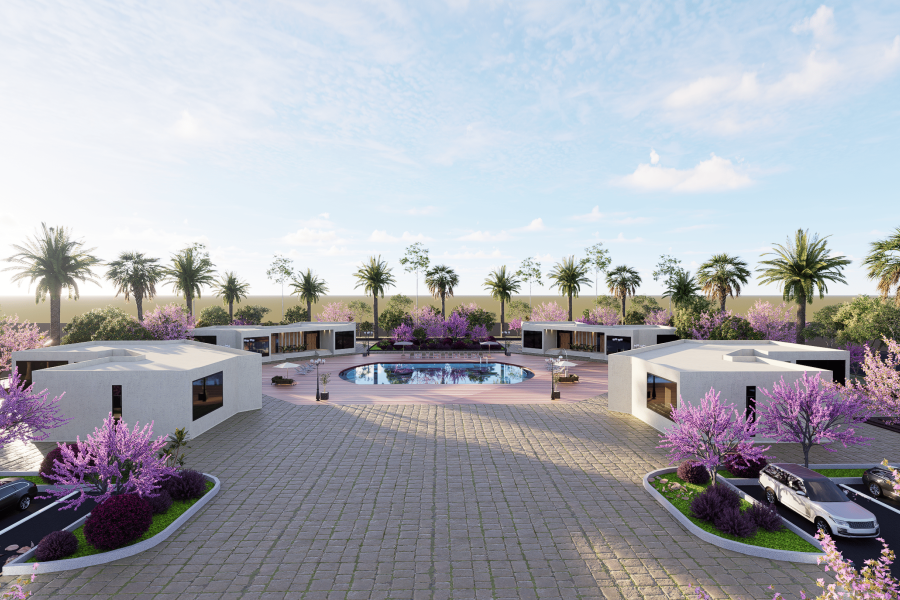 صُمِّمَ مشروع الكفرة الزراعي الضخم ليكون واحة عصرية تتكيف مع البيئة الصحراوية القاسية، حيث يمزج طرازه المعماري بين الفخامة والحلول المناخية الذكية. استُلهم المفهوم التصميمي من الواحات، حيث تشكل الكتل المستطيلة نظامًا واضحًا يتضمن أفنية داخلية مزروعة ومسطحات مائية لتلطيف الطقس وخلق بيئة مريحة. وللتكيف مع البيئة، يعتمد التصميم على نوافذ صغيرة محمية بكاسرات للشمس على الواجهات المعرضة لها. يجمع المشروع بين الصرامة التنظيمية والمرونة التصميمية، مع توفير مداخل منفصلة لكل مبنى لضمان الخصوصية. يتكون المشروع من مرافق متعددة، تشمل سكنًا للمهندسين والعمال، ومسجدًا، ومرافق ترفيهية، بالإضافة إلى وحدات فاخرة منفصلة لكبار الشخصيات، مما يجعله واحة عصرية متكاملة في قلب الصحراء.